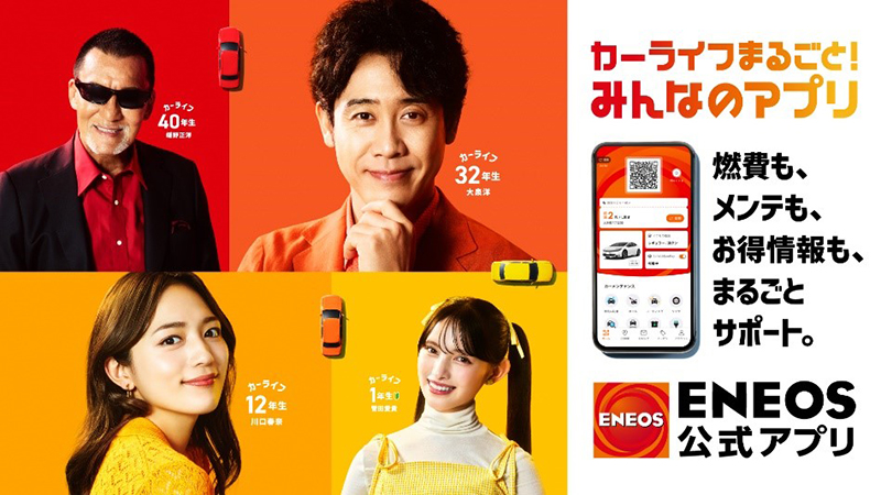 今回のCMでは、昨年から引き続き登場する大泉洋さんと川口春奈さんに加え、新たに蝶野正洋さんと菅田愛貴さんが仲間入り。ENEOS公式アプリの「マイカー登録機能」や「燃費計算機能」など、より便利で楽しいカーライフを実現するツールが紹介されているとのこと。