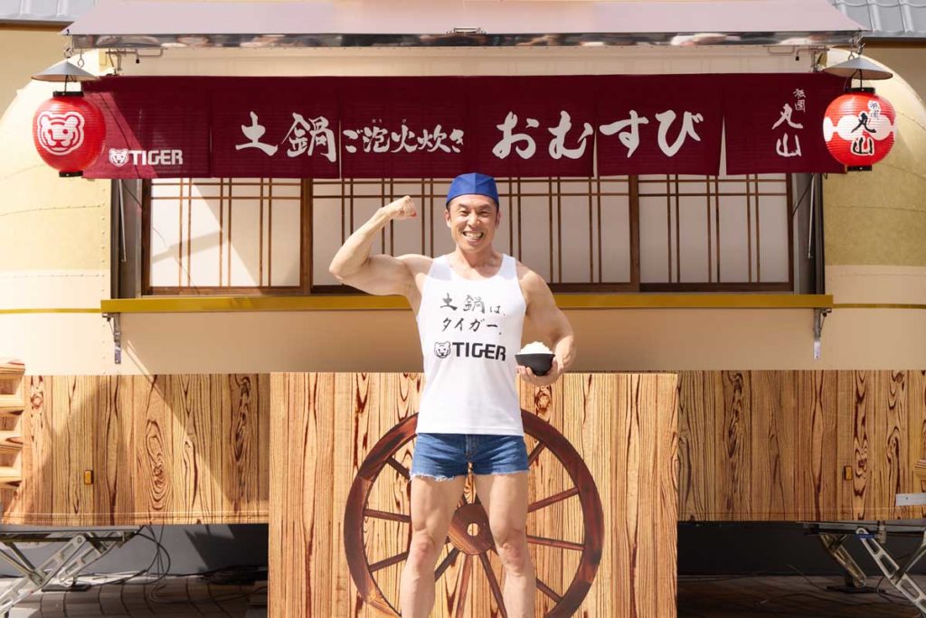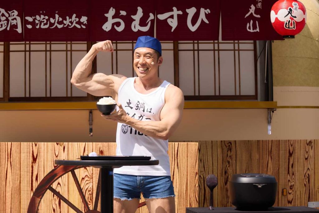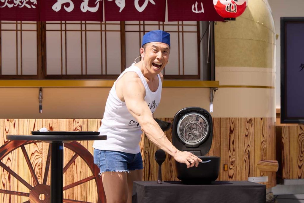 イベントでは、6月21日に発売されたタイガー魔法瓶の最上位モデル炊飯器「土鍋ご泡火炊き JRX-S100」で炊いたごはんを使ったおむすびが、なかやまきんに君から来場者に振る舞われました。自身も「ヤー!」の掛け声とともに炊きあがったばかりのごはんを試食。そのおいしさに、「土鍋で炊いたごはんは、一粒一粒がしっかりしていて、お米の甘みが全然違います!」と満面の笑みでコメントし、会場を盛り上げました。