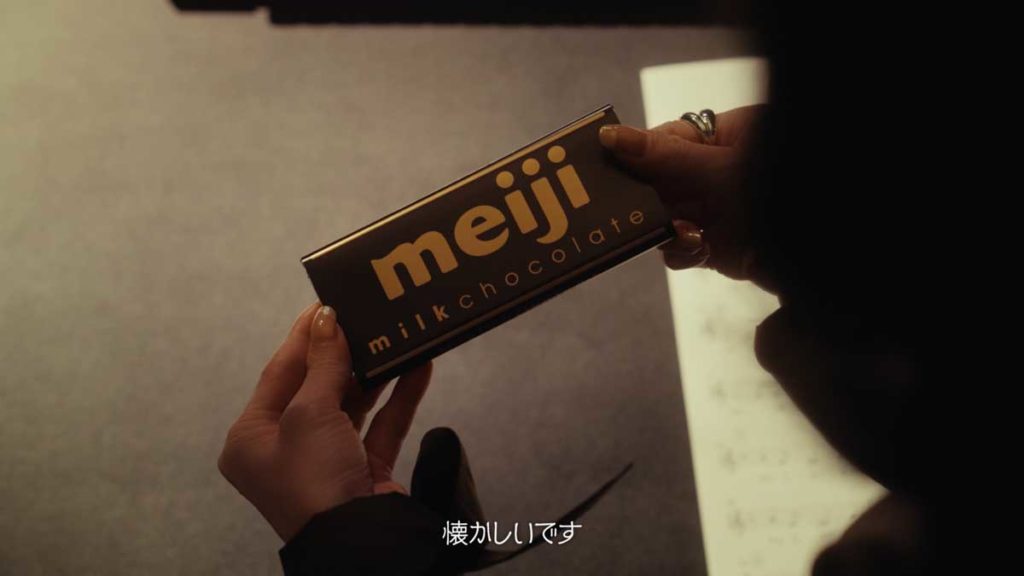 明治さんには過去たくさんコマーシャルにも出させていただいて、本当にお世話になりました。いろんなパターンでコマーシャルを撮らせていただいている中に、バレンタインデーの企画があって。その時は着物を着て、好きなボーイフレンドにチョコレートをどんなふうにあげたら気に入ってもらえるのかな、というのを、こうやって(板チョコを両手で手渡すしぐさをして) 鏡の前で練習するんですね。そのコマーシャルを撮っていた時の記憶が、昨日のように覚えています。