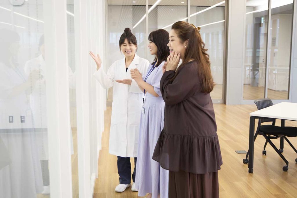 白衣に着替えた磯山さんと野毛さんは、9年の歳月をかけて商品が誕生した背景や、1,000種類以上の成分リストから独自の組み合わせ成分「MT-グロウコンプレックス」を厳選した研究の裏側に興味津々 。熱心に説明に聞き入る場面も見られました。開発のこだわりに触れた磯山さんは、「私たちの肌のために、たくさん研究していただいてるっていうのが本当に『うわーありがたいな』と思いました」と、感謝の気持ちを素直に表現しました 。