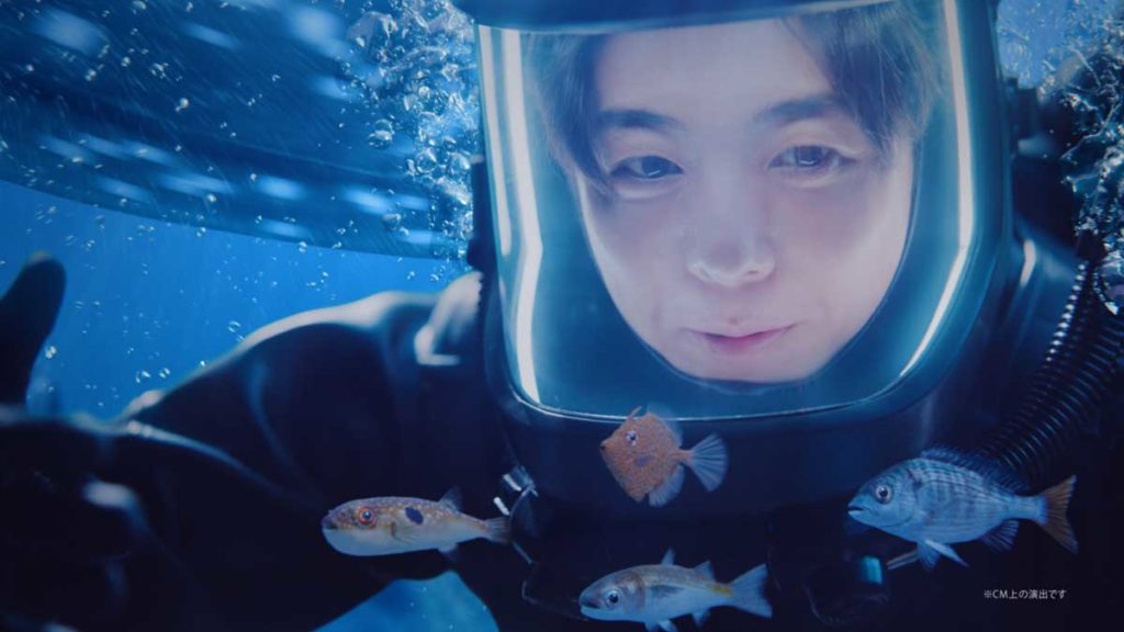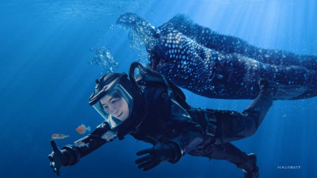 潜水シーンです。ワイヤーアクションは以前 「人魚の恩返し」篇でご一緒したチームだったので、非常にやりやすかったです。みなさんのフォローがなければとても暑かったと思うのですが、スタジオをキンキンに冷やしてもらい、衣装も普通の潜水服より軽量化するなどデザインを試行錯誤してくださっていたので、僕はただ吊られているだけでした(笑)。