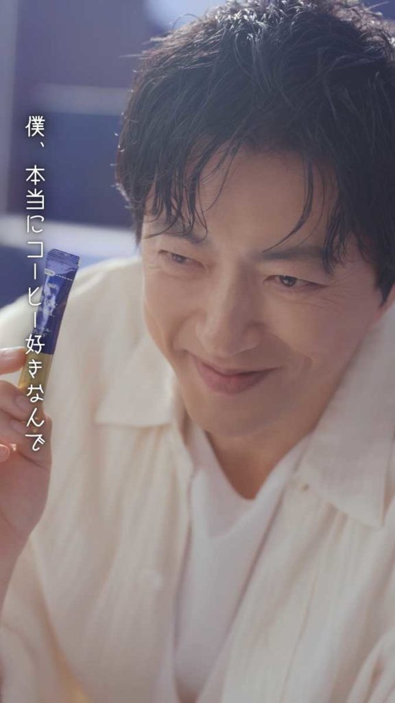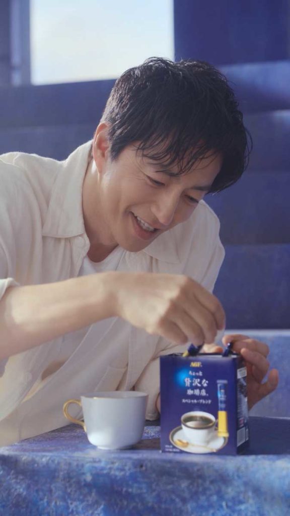 今回の新TVCMは、俳優の藤堂日向さん演じる、仕事を自分なりに頑張る現代のオフィスワーカーが主人公です。周囲とうまく関わりながらも、自身の頑張りは褒められる機会が少なくなった若者が「だれも褒めてくれないけどね」とつぶやくと、幻想的な青の世界から大沢さんが登場。スティックコーヒーを手に、<この一本で、自分に、ちいさな、がんばれを。>と心強いエールを送ります。