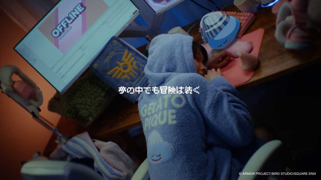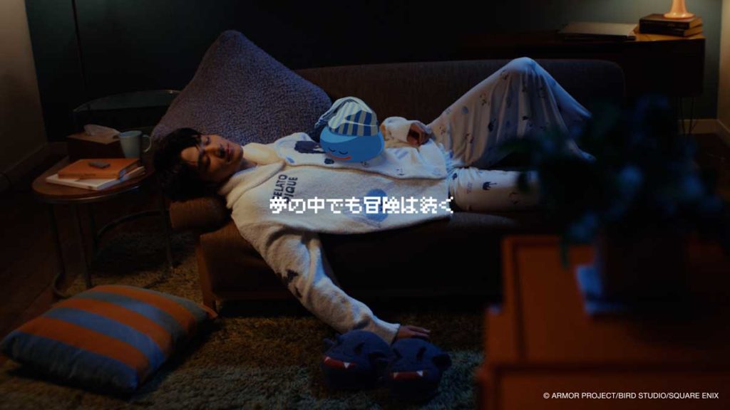 3人がそれぞれの部屋でコラボルームウェアに身を包み、すやすやと眠っているところへ、CGで描かれたスライムがそっと寄り添う様子は非常に印象的です。「誰かと寝ている安心感」や「やすらぎの中にある幸福」が表現されており、見ているだけで心が和む作品に仕上がっています。お揃いで着られるラインナップというコレクションの魅力を、豪華な出演者たちが伝えています。