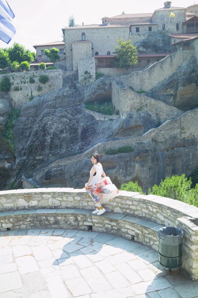 - 修道院とスカートのコントラスト メテオラ最大のメガロ・メテオロン修道院をバックに、スカートをなびかせた圧巻のショット。岩と同化したようにそびえ立つ雄大な修道院を前に、彼女の存在感が際立っています。