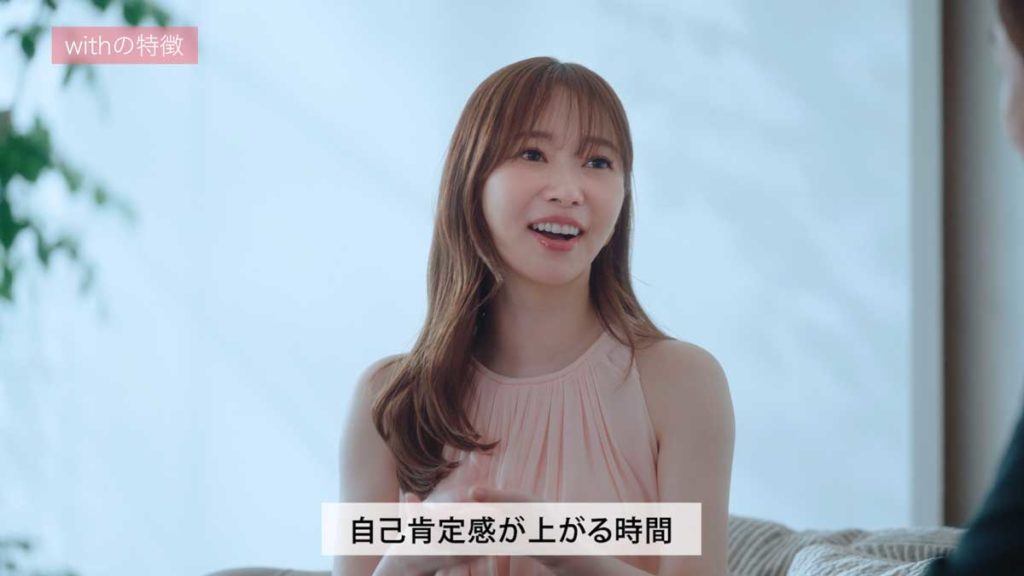 「価値観マッチングアプリ 『with』 のアンバサダーに就任しました、指原莉乃です。私の周りでも『with』でカップルになった人がいて、『まぶしいな』 『楽しいだろうな』、と感じていました。私も実際『with』を体験してみて、自己肯定感があがる感じや世界が広がるイメージを持ちました。『自分の価値観を代弁してくれる存在』として、マッチングアプリ 『with』 をもっと多くの方に知ってもらえるように頑張りたいと思います!」