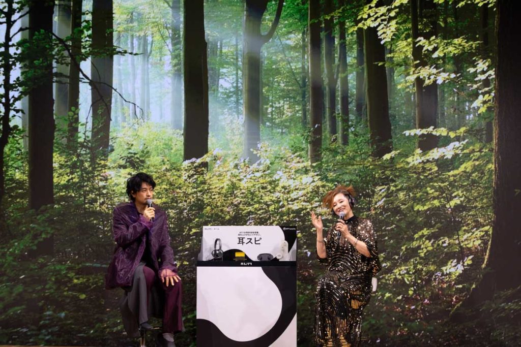 イベント中盤では、MCからの無茶振りで「耳スピの“開放感”」を即興で表現することに。スクリーンに森林の映像が映し出されると、夏木さんは「もう撮らなくて結構ですよ(笑)」と照れながらも、腕をしなやかに動かして音楽と自然が一体化する様子を表現。その表現力には斎藤さんも「素晴らしい…さすがです!」と感嘆の声を上げました。