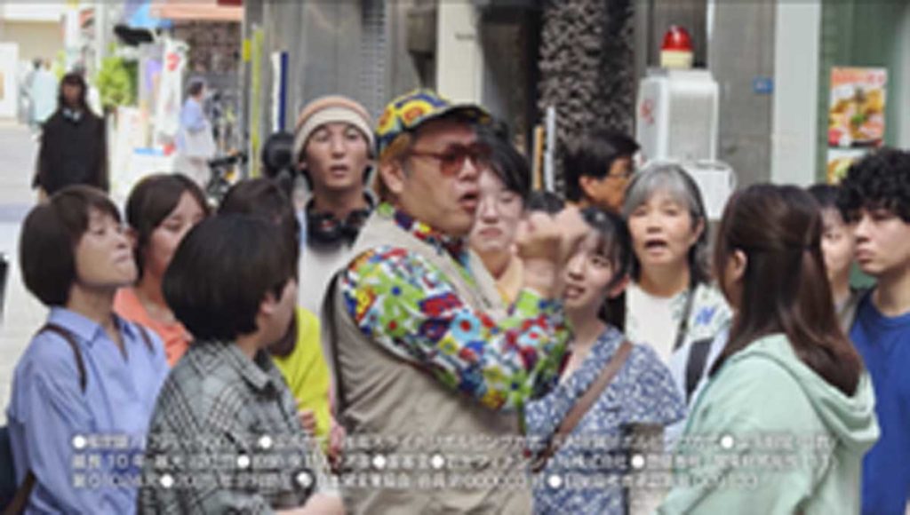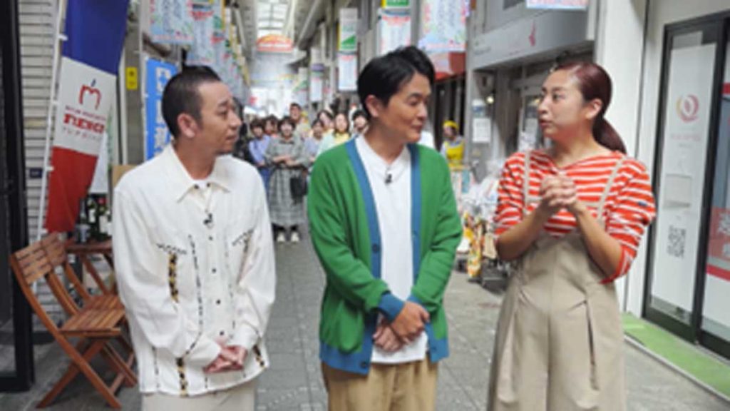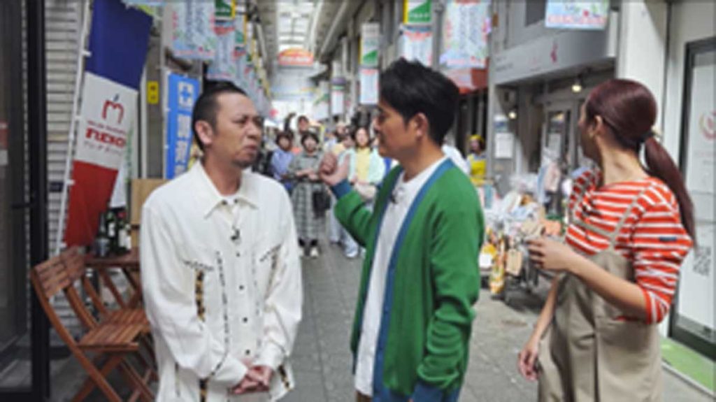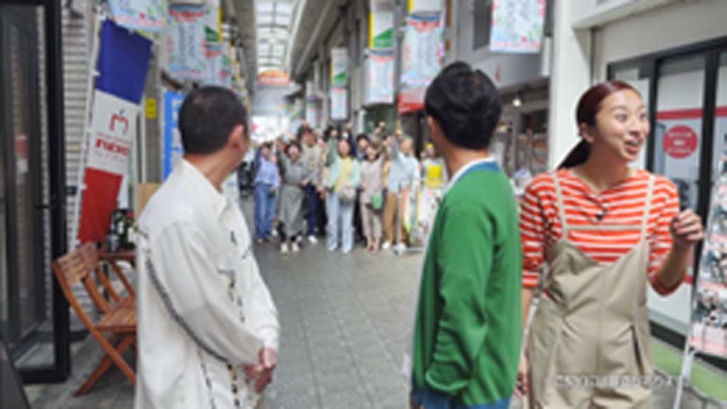 穏やかにロケが進む中、突如として背後の群衆から「レイクのアレって何なん!?」という叫び声とともに、奇抜なファッションに身を包んだくっきー!さんが現れます。その圧倒的な熱気に周囲の人々も巻き込まれ、商店街は騒然とした雰囲気に。