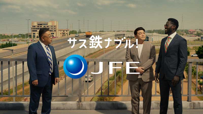 もう一つの「テマ高架橋篇」は、西アフリカ・ガーナの渋滞解消のために建設された「テマ高架橋」が舞台です。地域の発展に貢献するJFEの技術力に対し、現地の男性役がガーナの言葉で感謝を伝えるシーンから始まります。
