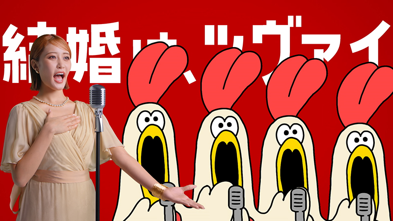 きらびやかな衣装を着た王林さんが、コケッコンのコーラス隊とともに 「結婚は、ツヴァイ」のフレーズを歌い上げています。王林さんの“歌声”が婚活成功の未来を祝福するようなCMとのこと。