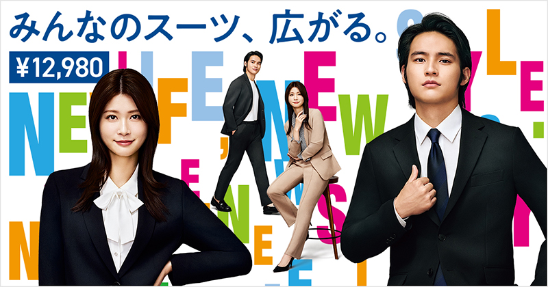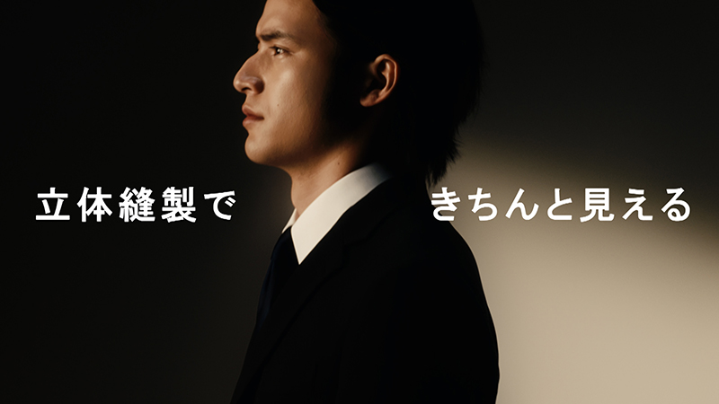 CMは「なぜ、みんなのスーツが支持されているのか?」をテーマに展開。学生から社会人まで、世代やシーンを問わず着用できる『みんなのスーツ』の魅力を描写。「どんなシーンでも」「学生」「社会人」「誰でも」というナレーションに合わせ、カットソーを合わせたカジュアルスタイルからネクタイを締めたタイドアップスタイルまで、2人の着こなしがテンポよく切り替わる構成。桜吹雪の中での笑顔やスマートフォンでの自撮りなど、現代的なライフスタイルを織り交ぜつつ、立体縫製によるジャケットの襟や肩周りなど、仕立ての良さが印象に残る映像。放送中のCM。