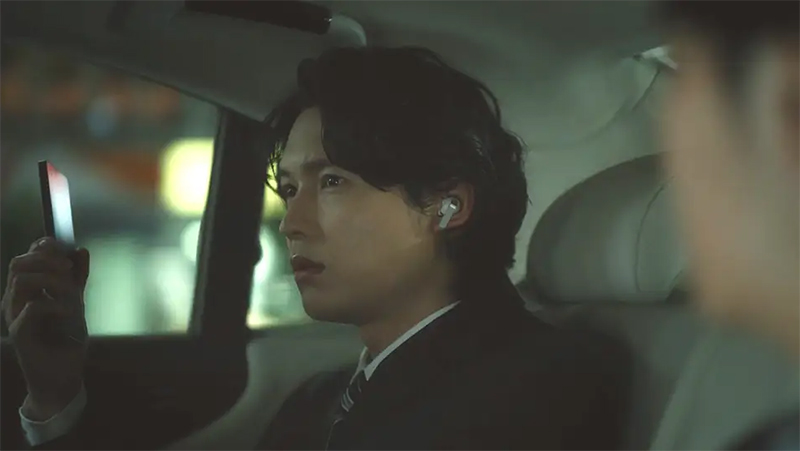 「タクシーの中で」篇では、車内で後輩から真剣な表情で楽曲を勧められる展開。静かな空間に漂う緊張感と松村さんのシリアスな表情がたまらない仕上がり。