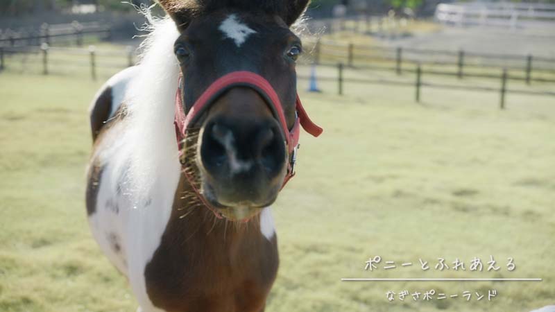まだ冬の寒さが残る2月初旬に行われた撮影では、鮮やかな赤の衣装を着こなした有村さんが様々なスポットを訪れました。「なぎさポニーランド」では、穏やかな性格のポニー「すももちゃん」と対面。ポニーを間近で見るのは初めてだったそうですが、棒につけたにんじんを差し出すと「わああ、にんじん大好きなんだね〜」と優しく声をかけ、すぐに打ち解けた様子だったそうです。おでこを撫でながら「かわいい〜!」と褒めるなど、動物との触れ合いに終始リラックスした笑顔を見せてくれました。