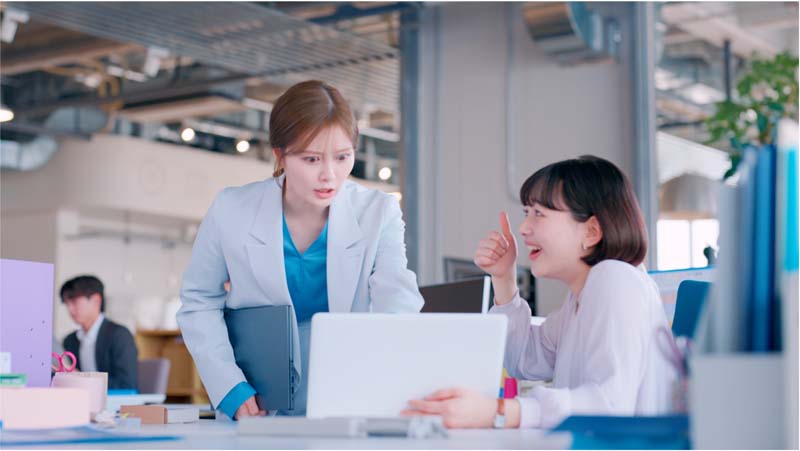 「後輩救出」篇では、ミーティング直前にミスをしてしまった後輩に対し、一緒に60分で片付けよう!と励ます頼もしい先輩を熱演。また、「緊急事態」篇ではデータが飛んでしまったチームを導く凛としたリーダー姿を、「ドライブデート」篇ではドキッとするような車内でのやりとりをスマートにかわす大人の女性を演じ分けています。彼女のコロコロ変わる魅力的な表情は必見です。
