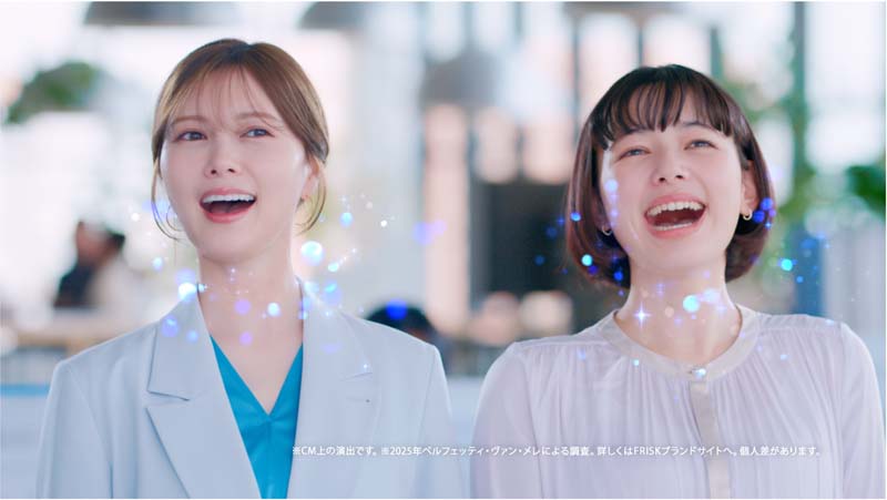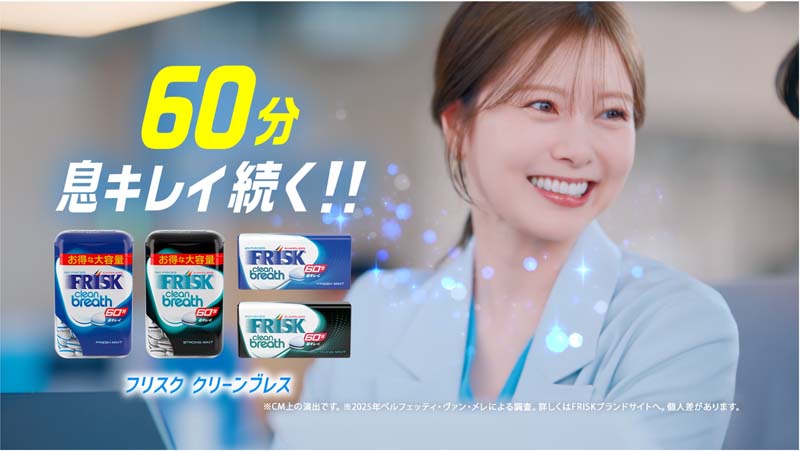 本日2026年4月1日(水)より一斉に放映がスタートした新WebCMですが、CM内で白石さんのピンチを救っているのが「FRISK クリーンブレス」です。緑茶抽出成分を配合した大粒タブレットで、キレイな息が60分間持続するのが特徴です。