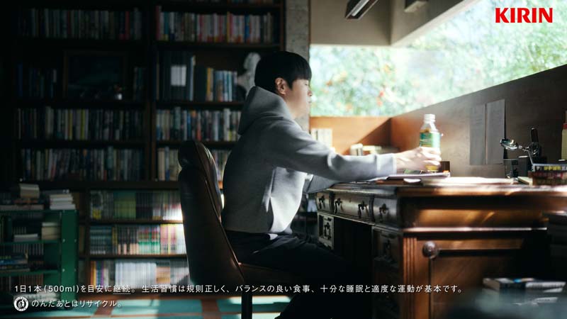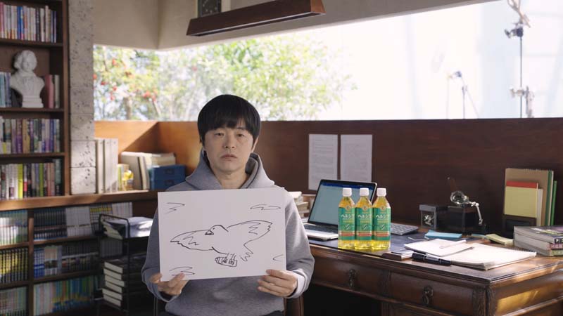 原稿執筆の合間におもむろにお茶を飲み、画面には「こう見えて、脂肪消費中。」という印象的なメッセージが浮かび上がります。特別な運動などを頑張る瞬間ではなく、何気ない日常の中にある体を気遣う選択が、バカリズムさんの自然体な演技を通じて表現されています。